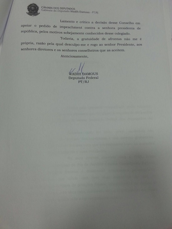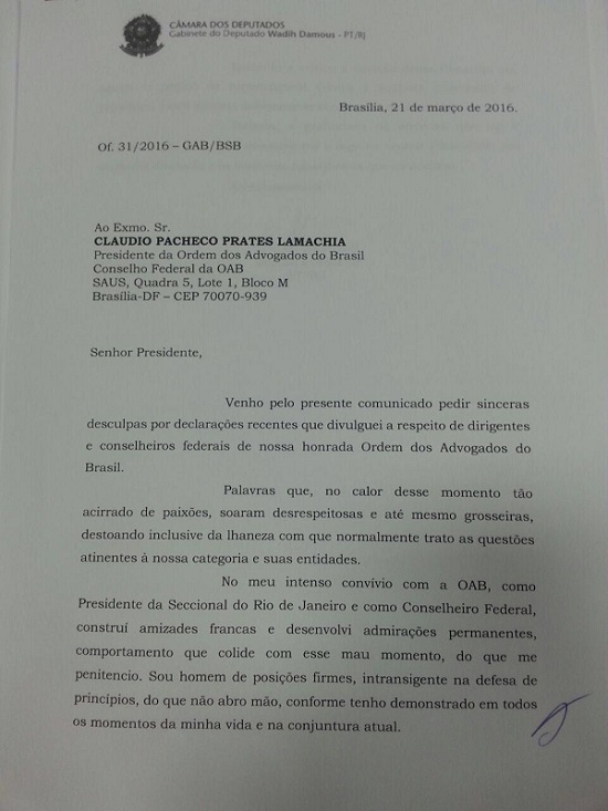 O deputado Federal pelo PT Wadih Damous, ex-presidente da OAB/RJ, pediu desculpas ao presidente da OAB Claudio Lamachia por declarações em que criticou a posição do Conselho Federal em apoiar o impeachment de Dilma.
